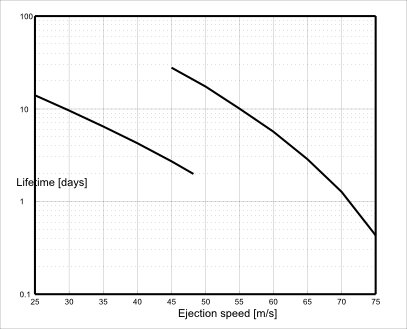 The time from release to destruction is shown, as a function of release velocity, for two drag areas: CdA of 0.5 m2 and 5.0 m2